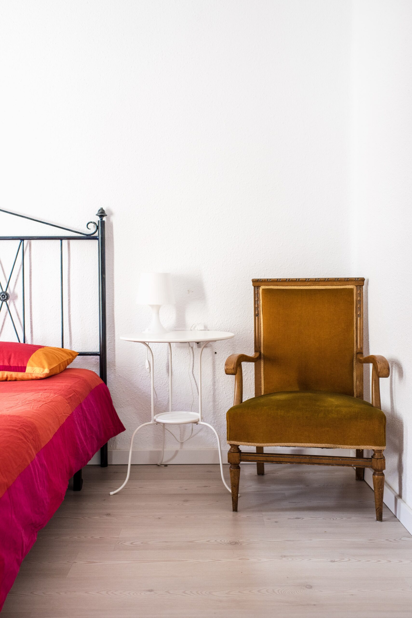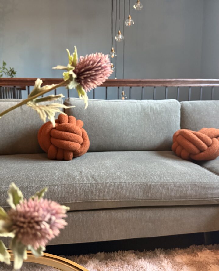 What I love most, though, is how it plays with the light. Morning sun filters in and dances across the textured fabric, and in the evening, the amber glow from my overhead pendant bulbs creates the coziest vignette. The burnt orange knot pillows I added for contrast give the whole setup a playful, sculptural quality that keeps it from feeling too serious.