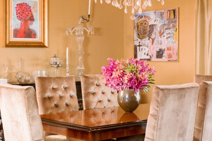 Ayesha Curry is not only an incredible cook but also a host as well, so it’s only fitting that she has an equally incredible dining room to serve her delicious meals. The family dining room is the definition of modern and simple. It features a wooden oak table and a set of black dining chairs that strike the perfect balance between modern and traditional. Decor is very minimal — a pair of candles, flowers, a gorgeous rug, and wall art add just enough personality so as not to take away from the true star of the show: the food.
