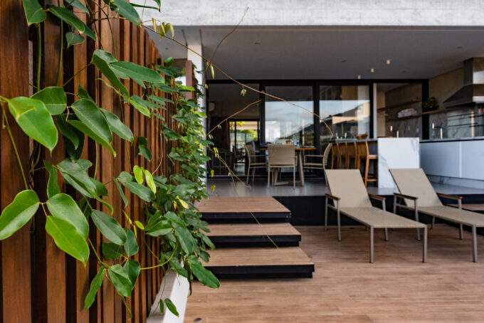 There’s something intriguing about the flickering flames of a fire pit or outdoor fireplace. Why not build a look around this energizing element? Dress things up with torches or soft uplighting to accent the flames. It’ll make making s’mores or enjoying an evening drink feel even more magical.