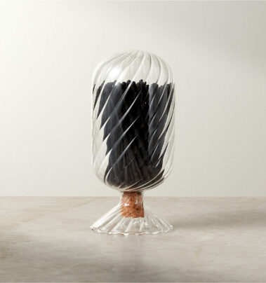 A glass match cloche instantly elevates any candle moment. This handblown version from CB2 holds 120 black matches and includes a strike-on-bottle flint for easy lighting. The subtle spiral texture adds interest without feeling fussy, and the cork stopper gives it a clean finish.