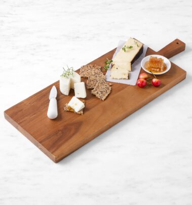 This acacia cheese board brings natural warmth to any spread. The wood’s rich grain makes every piece unique, and its smooth finish is gentle on knives while offering a sturdy surface for slicing and serving. With its elongated shape and easy-grip handle, it transitions effortlessly from kitchen prep to a polished presentation on the table.
