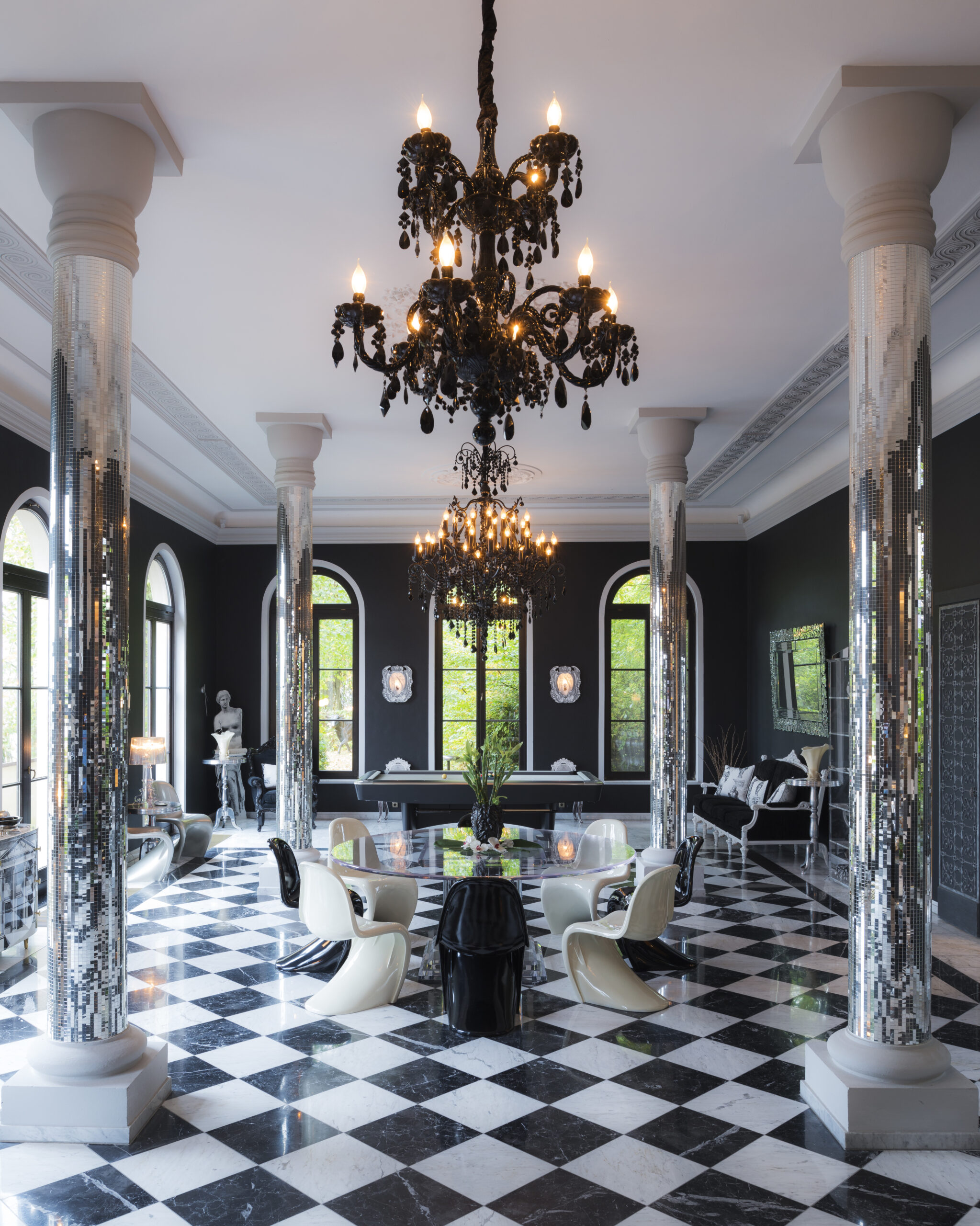 Transform your dining room into a great hall with an ornate table featuring carved details, vintage silverware and china, and a statement chandelier. Gothic-inspired dining chairs complete the medieval feast setting.