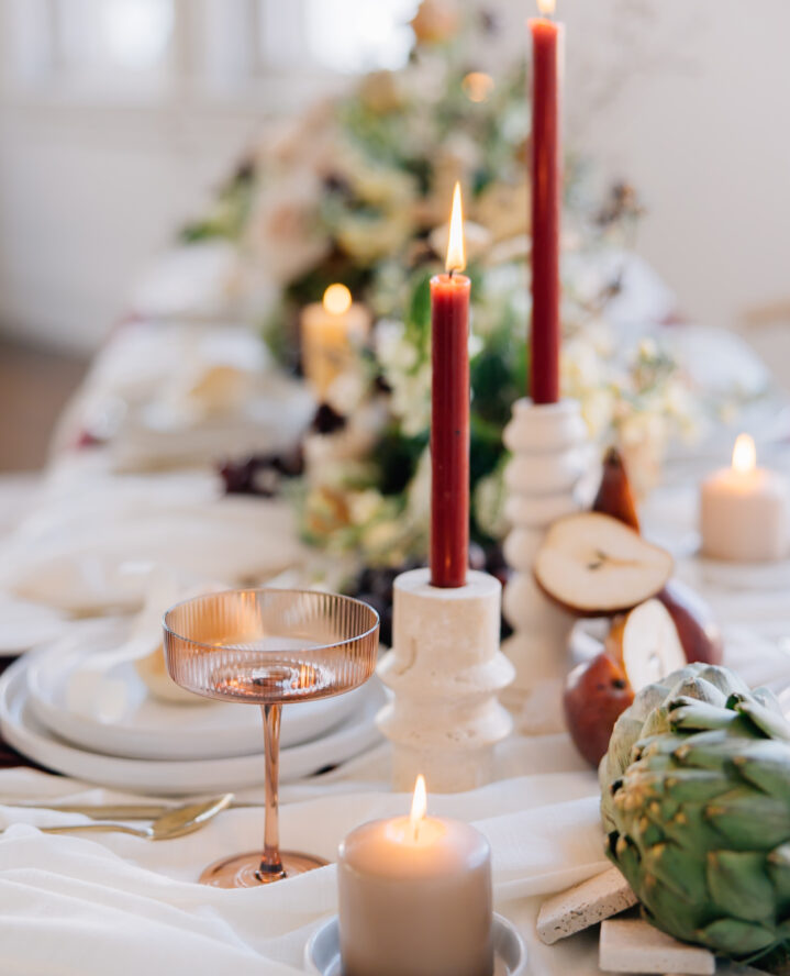 Layer in simple place settings—think black flatware, sculptural dinnerware, and crisp napkins—to keep the overall look balanced. Then, complete your table with bold floral arrangements or deep-toned candles to add contrast, just like Ebs did with her moody red setup.
