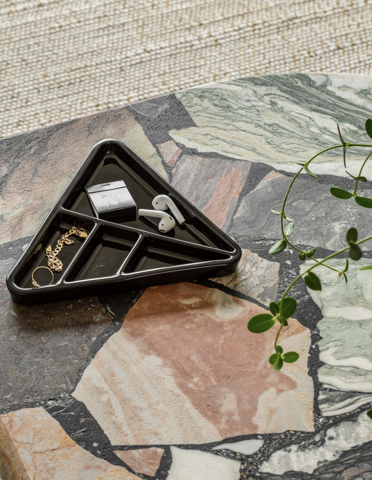 The catchall tray, in a glossy black ceramic, was inspired by a deconstructed paper plane. The grooves taking the place of paper creases, form four compartments for all your necessities. On a table, in the bathroom, or anywhere you want to have easy and organized access to your everyday items.