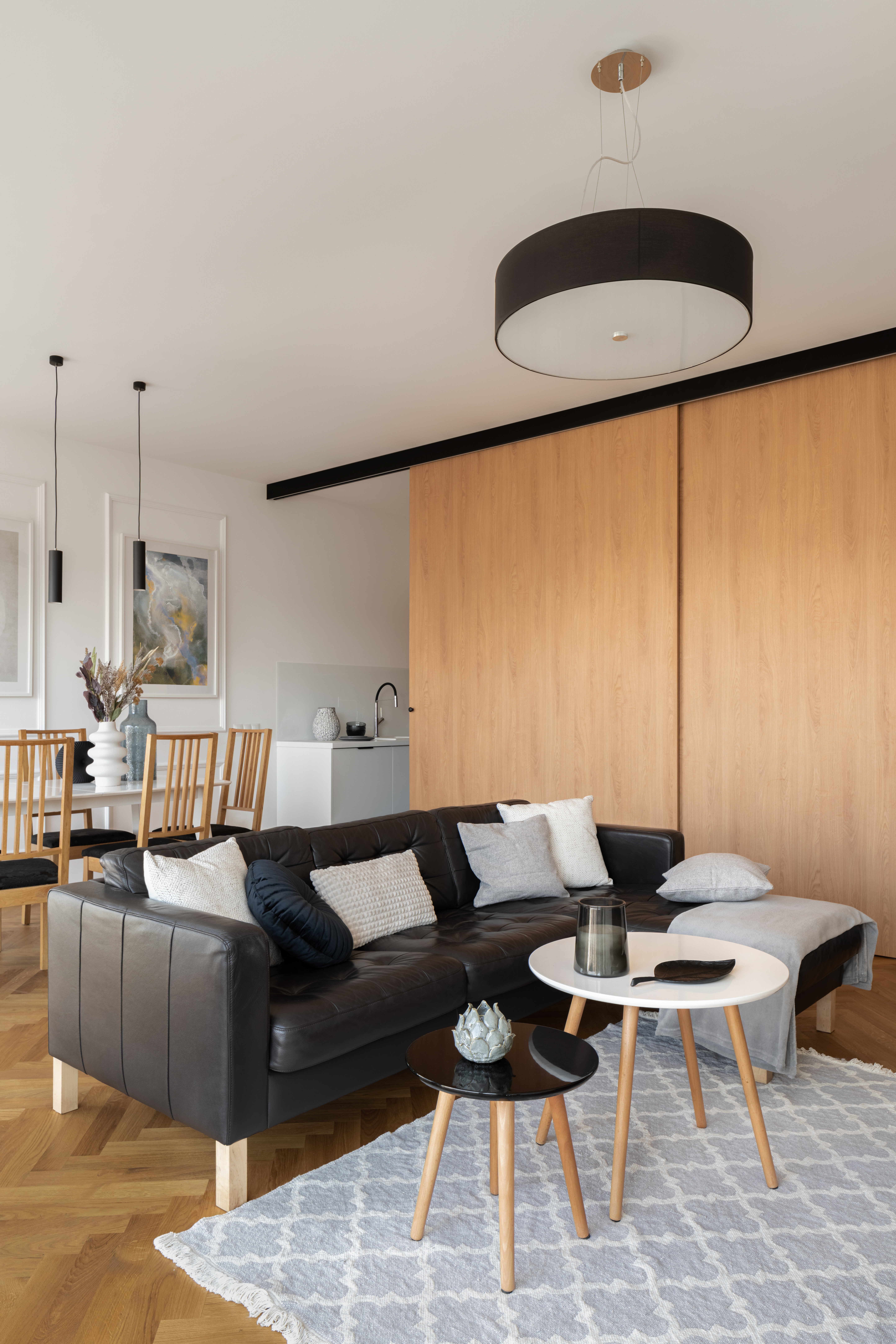 Despite looking complex, this DIY project came together easily. Like a traditional door, it required just a few tools and hardware to get the job done. After removing the original door from its hinges, they added drawer slides to the top and base of the wall and mounted the artwork. With one swift motion, the door slides from one side to the other, continuously displaying the painting.