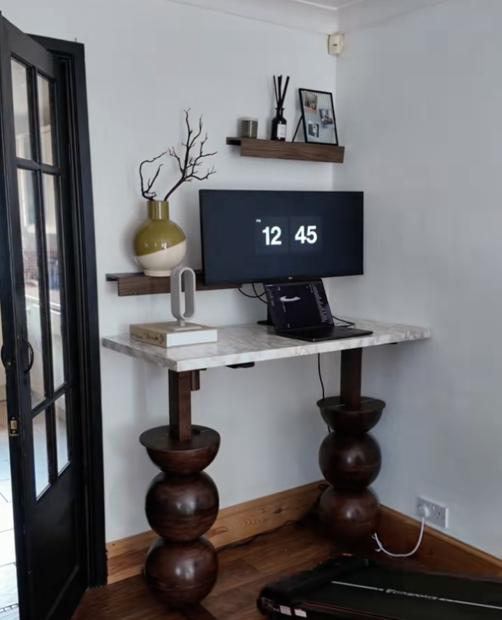 According to King, the commenter raised a valid point about the legs of her standing desk. “When the desktop is down, I’m obsessed with the look. But the second it’s raised, the legs look a little awkward,” she says. This is due mainly to the globes that sit at the base of the desk. Unlike the others on the legs, which are fully formed, the uppermost globes are chopped in half, revealing their hollow insides when the desktop is raised.
