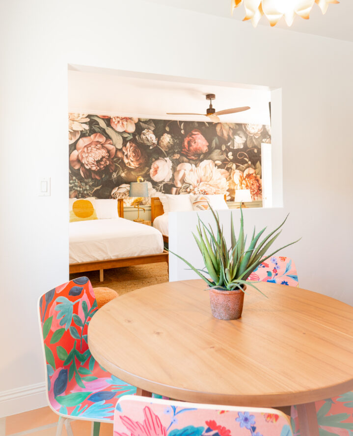 “We wanted to create a new oasis in the desert but contrast the built environment with the natural desertscape,” Pardo explains. “Teaming up with muralist Ouzi (Louise Jones) was essential to balance the cacti and desert landscape we planted with the colorful and soft aesthetic of the oversized floral art. The effect is a dynamic, encompassing environment that changes throughout the day with the balance of light and shadows. Floral murals and natural cacti pop equally against the black backdrop of the casita walls.”