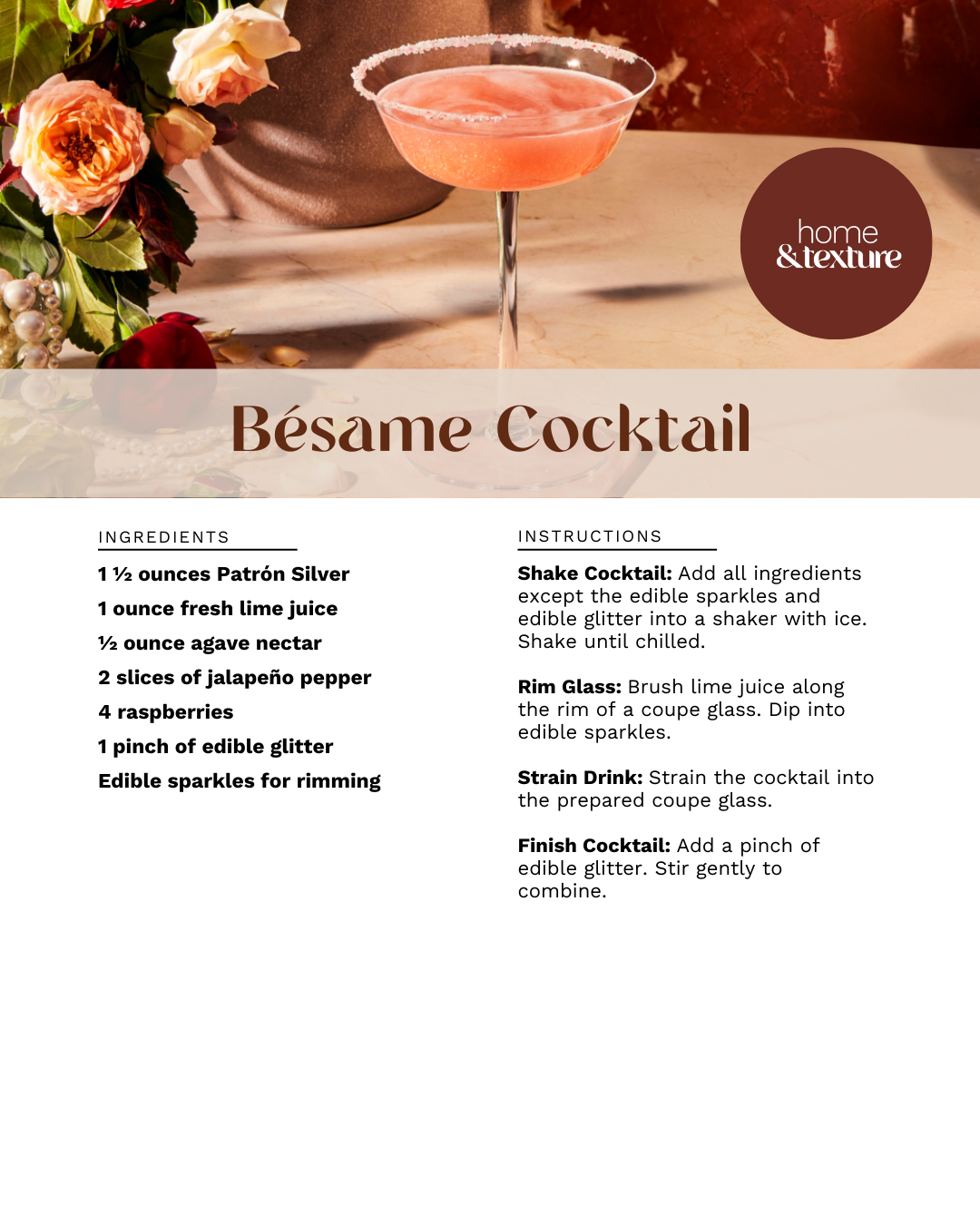 “Galentine’s Day is sacred. It’s the group chat coming to life. It’s soft glam, heels by the door, music up, and your girls walking in already hyping each other. A signature cocktail like the Bésame sets that tone instantly. She’s pretty, she’s bold, and she has a little kick to her. Just like the women at the table,” Garner tells Home & Texture.