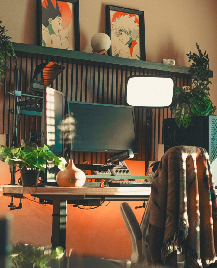 Now that it’s fall, the warm color scheme that covers Shotou’s PC setup offers the cozy environment that he envisioned, and the potted plants complement the desk’s earthy hues. According to him, the desk riser is one of the best additions to his desk, since it’s a clutter-free way to keep a productive workspace. Even though he’s been streaming on Twitch for a handful of years, Shotou’s computer space is also multi-functional to support his professional photography career.