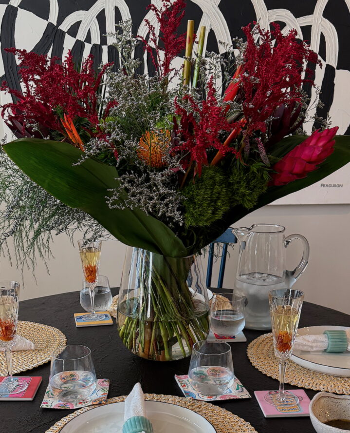 I hosted a few of my friends at home for a July dinner that felt like a vibe. My husband helped with the flower arrangement and made the coffee. We set the table, turned the music up, and turned our home into a space that felt intentional without feeling too polished. That’s the energy I wanted to create. One that’s relaxed, personal, and full of color.