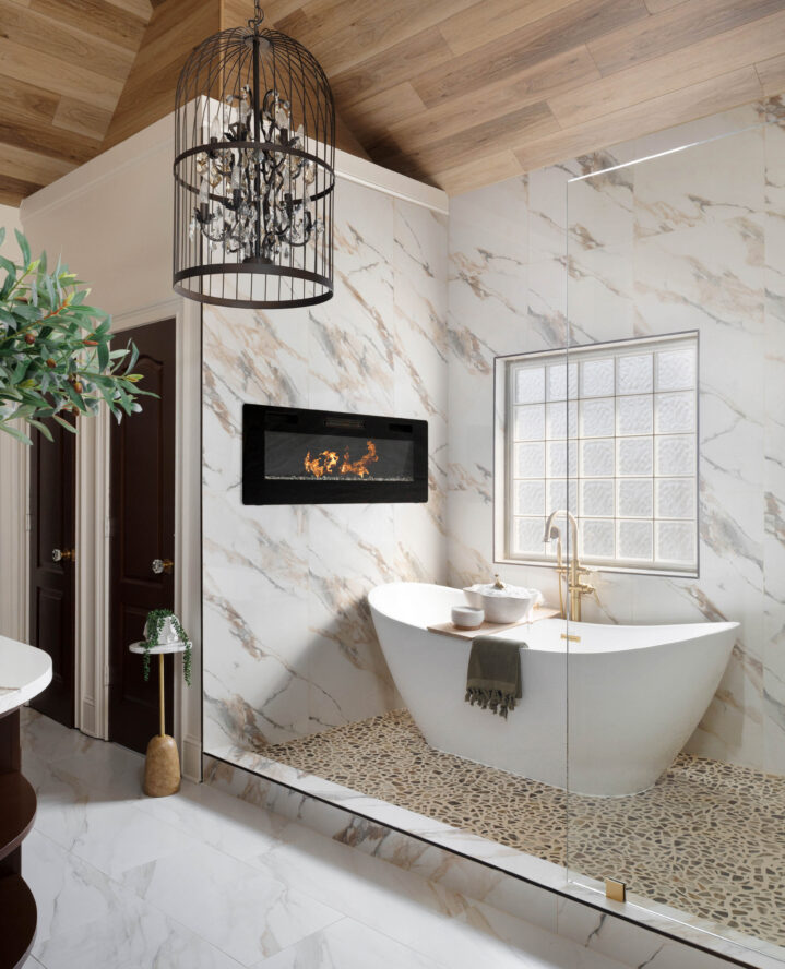 At the center of the room is a freestanding tub set against dramatic marble tile, creating a focal point that feels both indulgent and grounding. Nearby, a sleek, built-in fireplace adds warmth and softness — an unexpected touch that reinforces the idea that this is a space meant for lingering, not rushing through a routine.