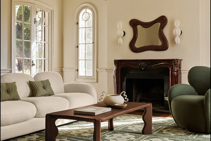 Think of mermaidcore as the modern version of the coastal grandmother aesthetic. Instead of opting for muted seashells, you can upgrade to pearls and iridescent accents. Even shapes play a big part in this feverish trend. For example, scalloped edges make great for rugs, mirrors, and lampshades, which can add a playful yet posh element to any home.
