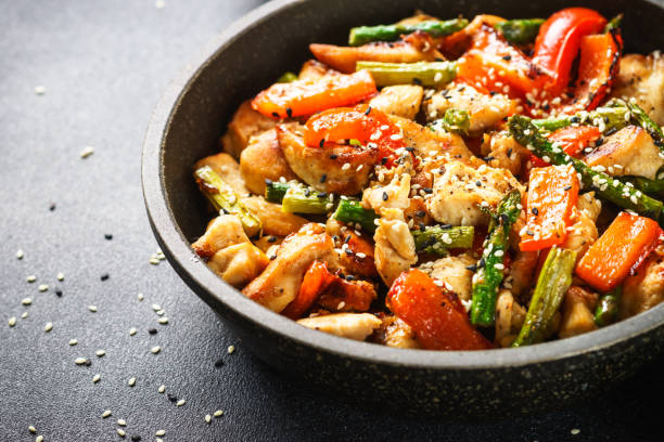 Add oil to a large pot and cook chicken over medium-high heat. Then add cabbage, pepper, carrots, and peas, and cook for 2-3 minutes, until veggies are softened slightly.