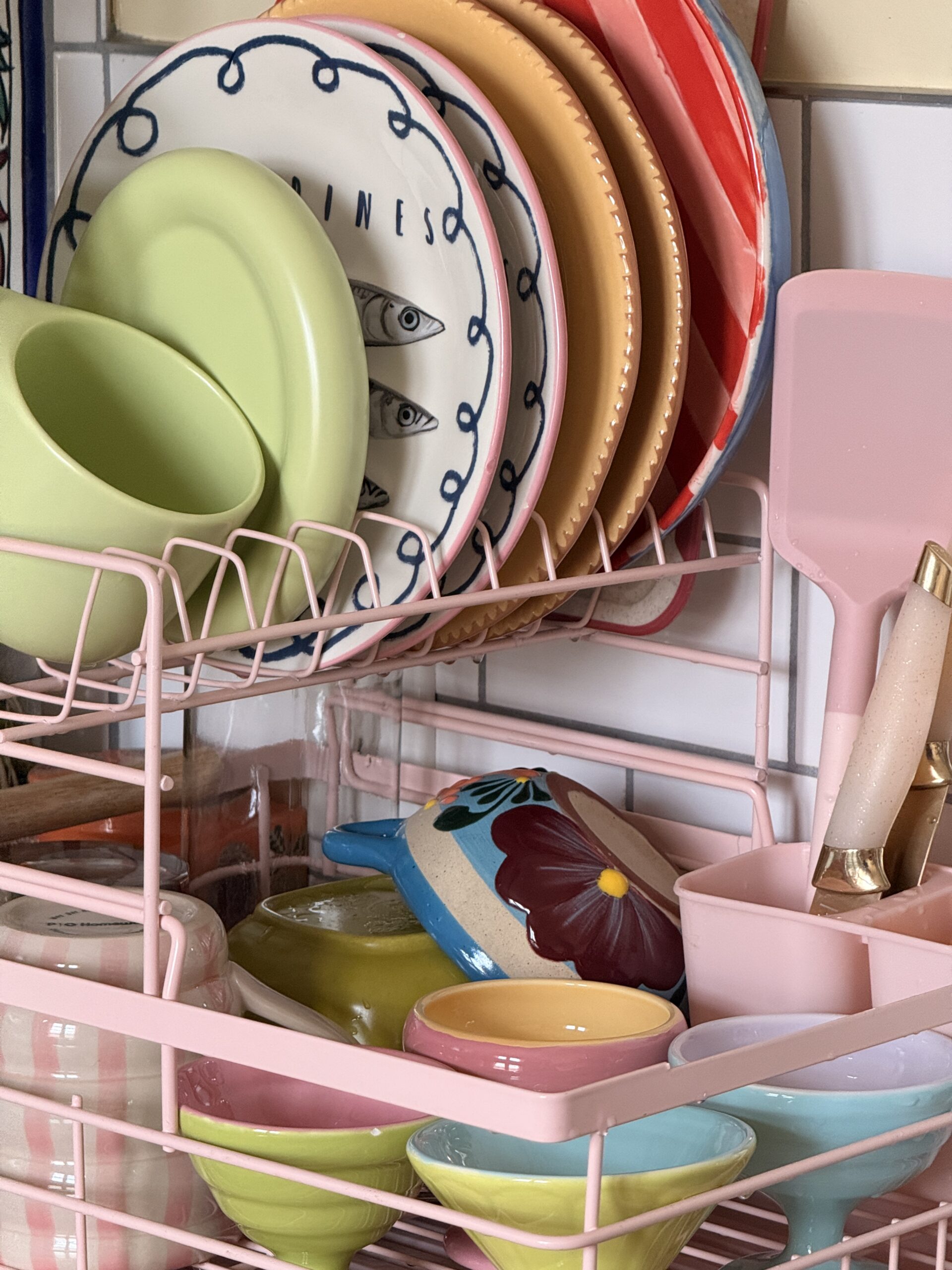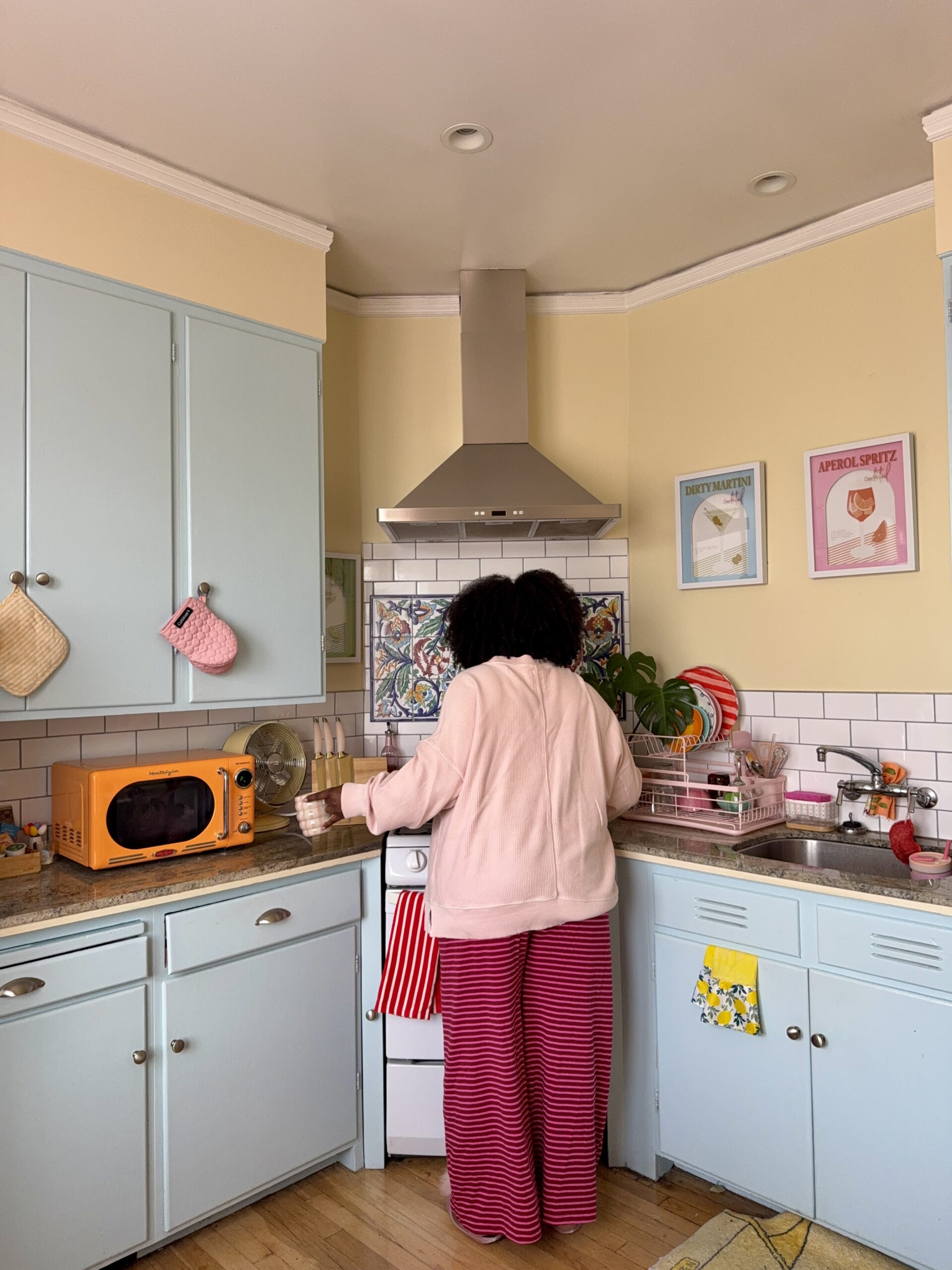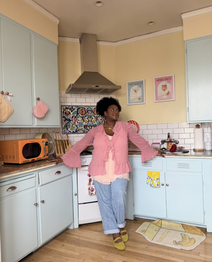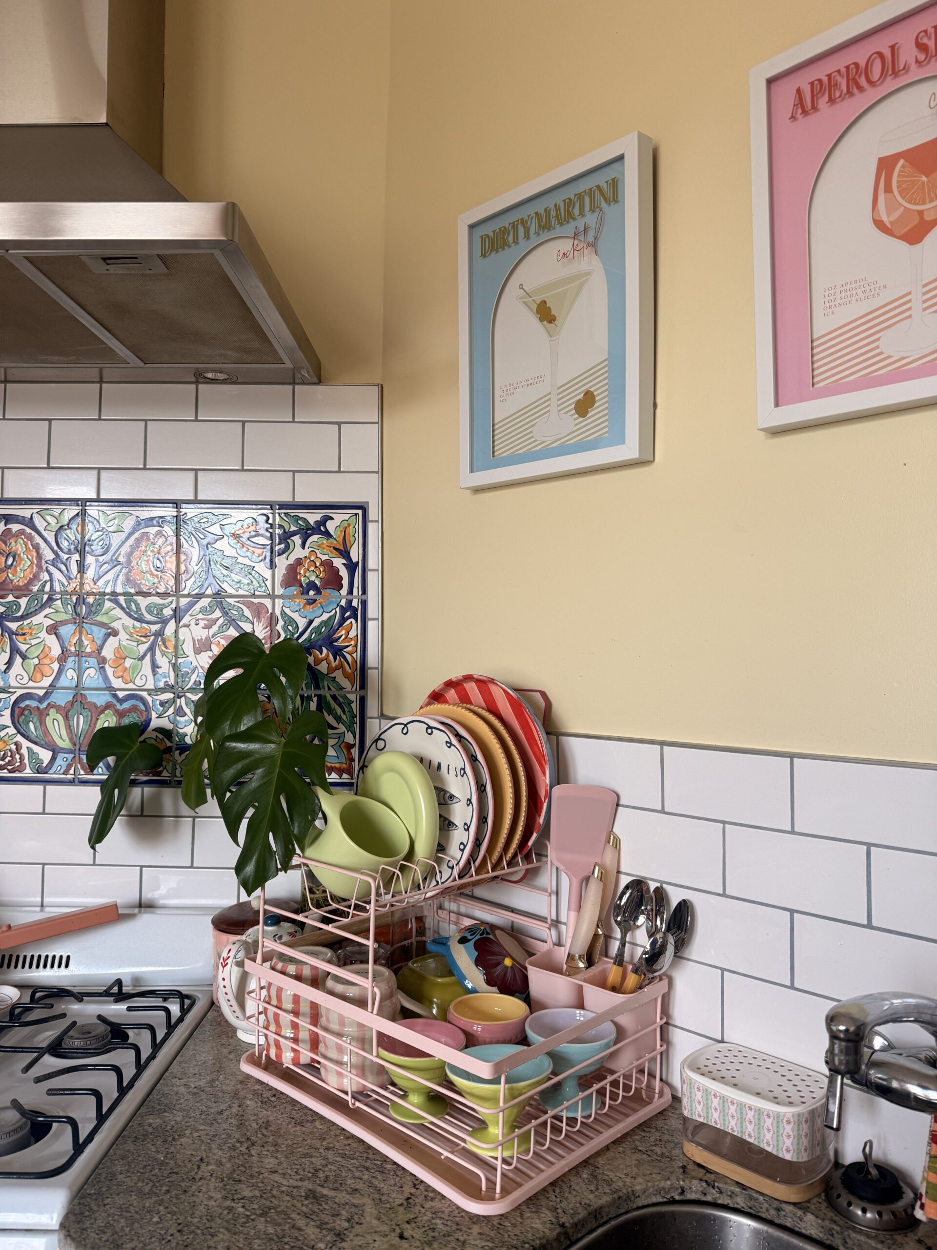 Color is the connective tissue throughout this space. Soft pastels and candy hues move seamlessly from corner to corner, creating visual continuity without uniformity. In the kitchen, pale blue cabinetry, warm yellow walls, and playful accessories transform a traditionally utilitarian space into something expressive and lived-in. Vintage-inspired art prints — from cocktail illustrations to travel motifs — bring a sense of escapism, while Lauren’s fun thrifted dishes and accessories reinforce the point that taste matters more than budget.