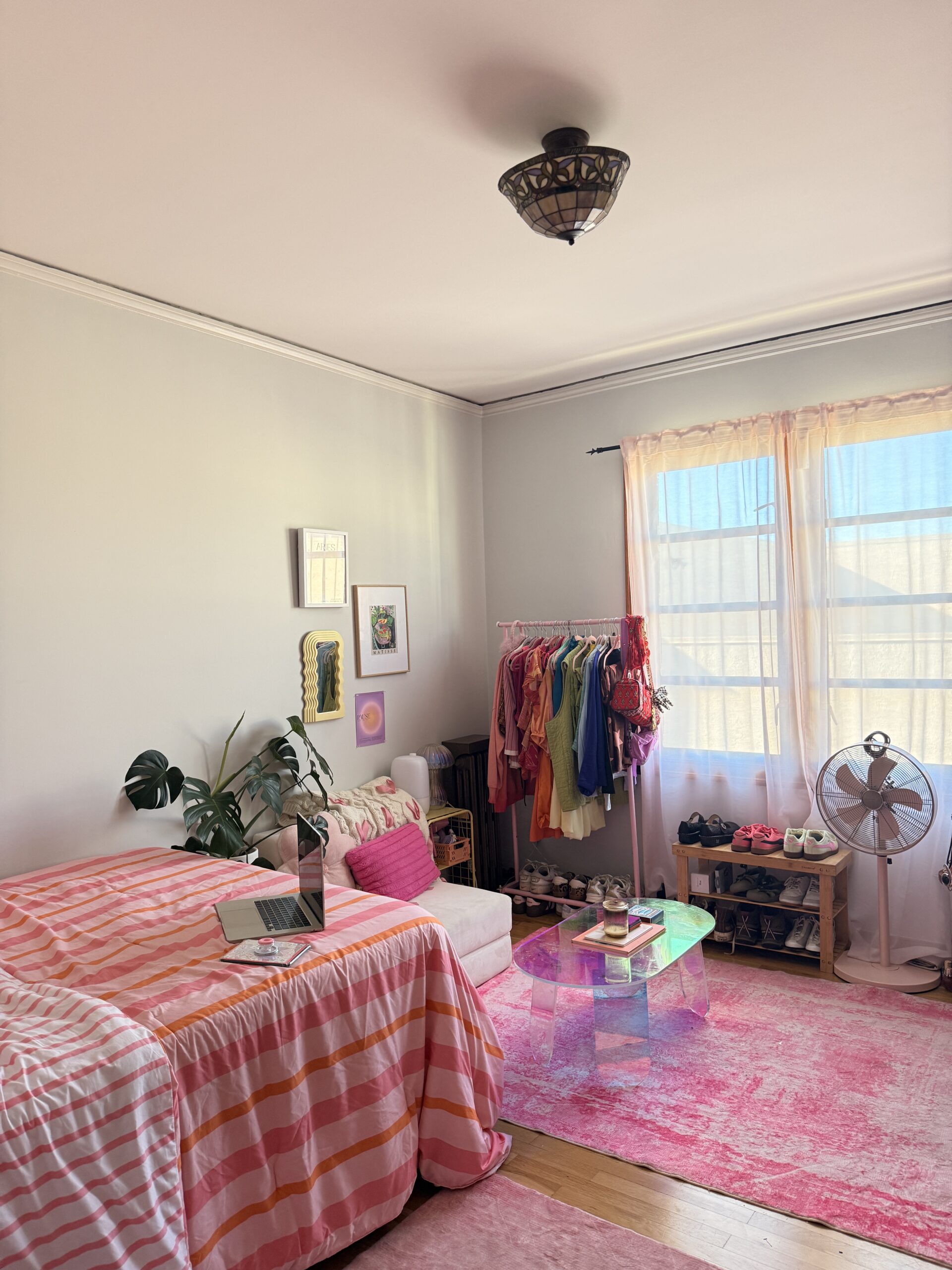Lauren describes her design style as whimsical, lively, and eclectic — and the space delivers on all three. Rather than designing for longevity or resale appeal, she designed for self-recognition. “I combined my inner child’s dream dollhouse with the present version of myself,” she says, landing squarely back at the word that anchors the entire apartment: girly.